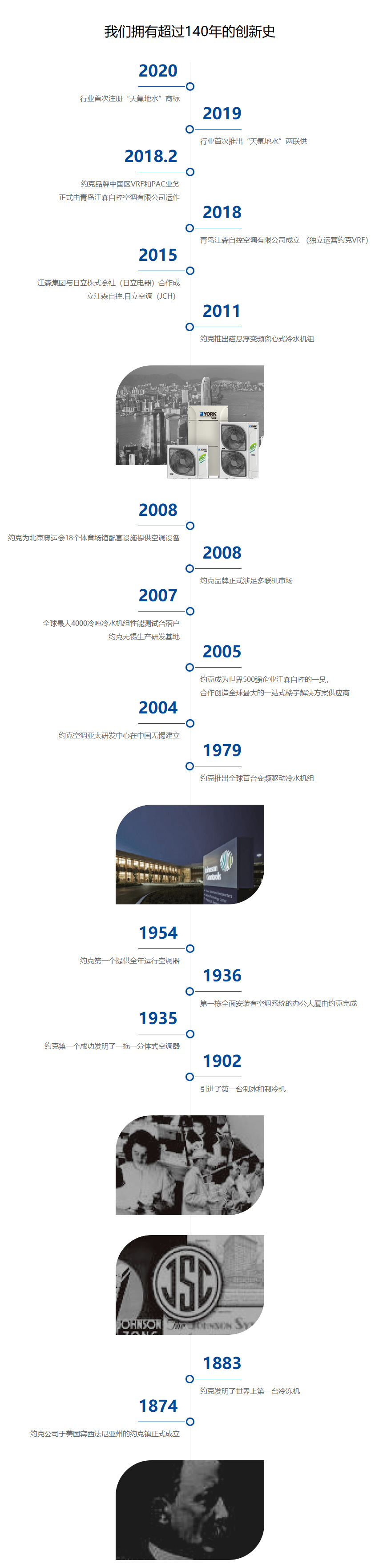 Johnson Controls(江森自控)是全球多元化技术和工业领域的领导者,业务遍及150多个国家。公司旗下120000名员工通过创造性地营建智慧建筑、高效能源解决方案、集成基础设施和新一代交通系统,并使之相互精准配合,实践公司建设智能城市和社区的承诺。公司始终致力于提高建筑设施效率、舒适度、安全性和可持续性,在世界各地为客户提供优质的产品、服务和解决方案,并帮助客户优化能源效益,降低楼宇运营成本。2005年完成有史以来最大一笔收购:遍及全球的约克国际空调公司的加热、通风、空调和制冷产品。截至目前,江森自控已成为一站式综合智慧绿色建筑系统、服务和解决方案的专业供应商。
